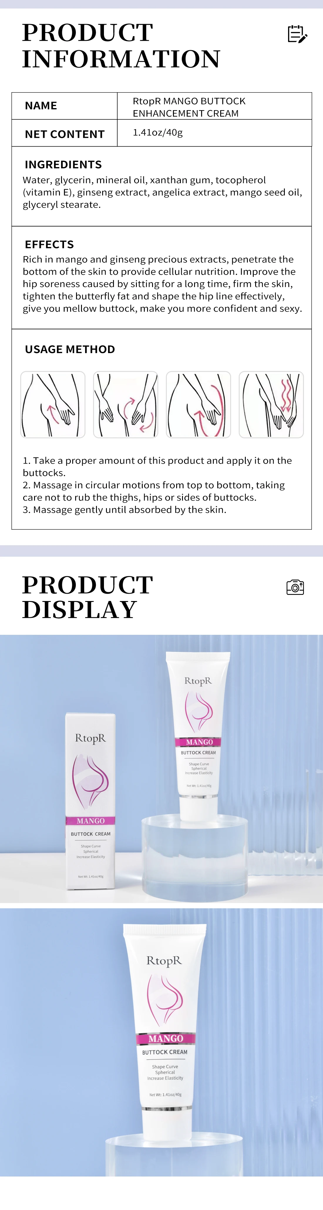 Apply proper amount of the product to the buttocks and massage in circles from top to bottom, be careful not to rub on the thighs, crotch or both sides of the buttocks, recommend twice a day when skin is warm after shower or bath.
