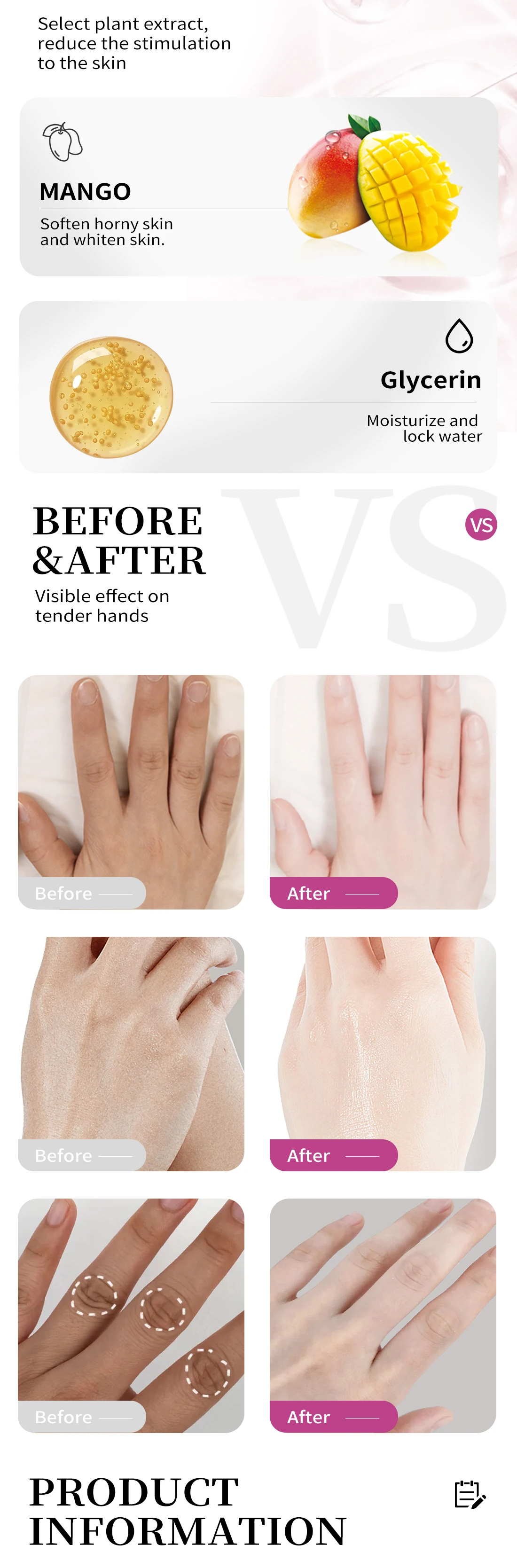 Mango essence integrates multiple nutrients to form a moisturizing and nourishing wax film on the hands,nourishes the hands gently and intensively,alleviates dry,rough,cracked and dull skin conditions. Moreover,can help remove old and old cutin,tender and bright skin,and make the hands shiny and shiny.