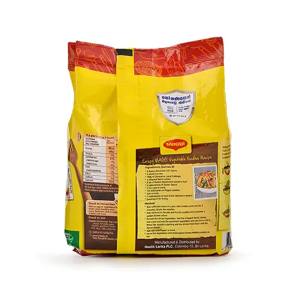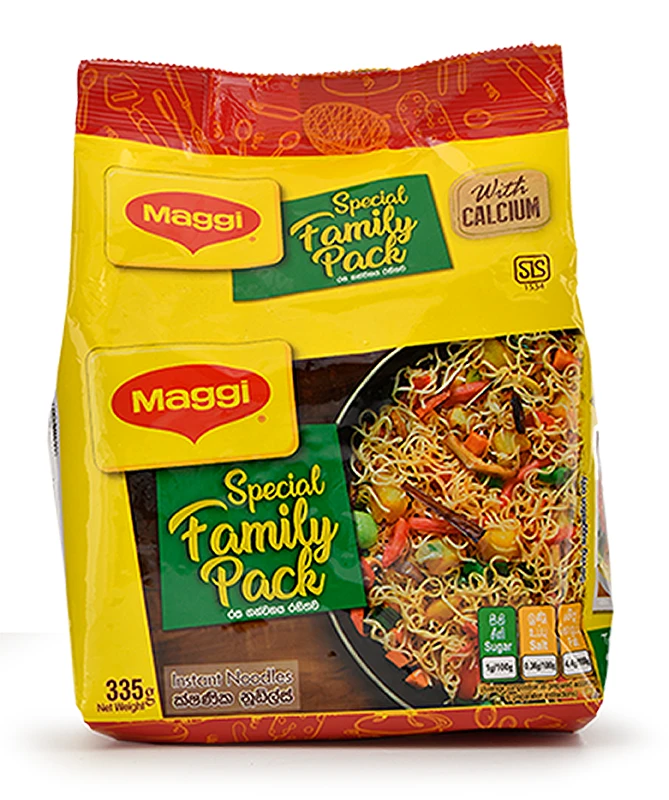 මැගී පවුල් ඇසුරුම – මුළු පවුලටම ආහාර වේලක් ලබා දෙන අතර අස්ථි හා දත් සෞඛ්ය සම්පන්න වීමට අත්යවශ්ය වන කැල්සියම් වලින් පොහොසත් වේ. හෘදයාංගම ආහාර වේලක් ලබා ගැනීම සඳහා එළවළු සහ මස් එකතු කළ යුතුය. සකස් කිරීම – පෑන් තුළ ප්රමාණවත් තරම් ජලය තම්බා ගන්න. නූඩ්ල්ස් එකතු කර විනාඩි දෙකක් උයන්න. නූඩ්ල්ස් පෙරා ගන්න. කැඩුණු එළවළු, බිත්තර, කුකුළු මස්, මුහුදු ආහාර හෝ වෙනත් ඕනෑම මස් වර්ගයක් සමඟ සංසුන් වන්න. රස අනුව ලුණු එකතු කරන්න.